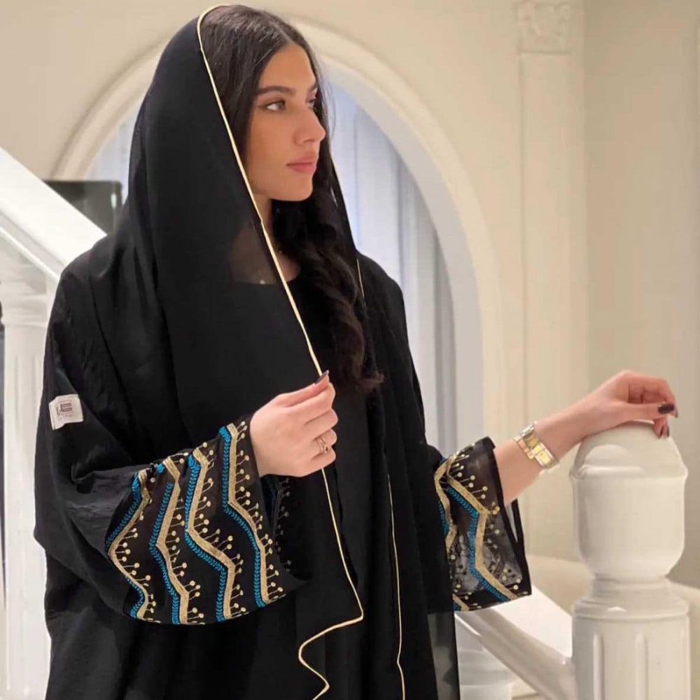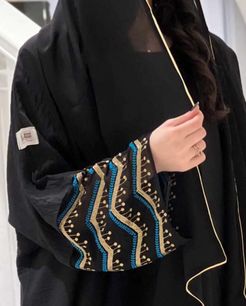 لينن بحريني + كم مطرز بالترتر وخيط باللون التركواز - قصة واسعة