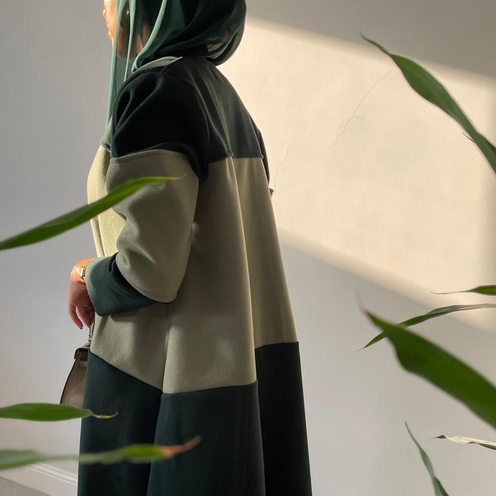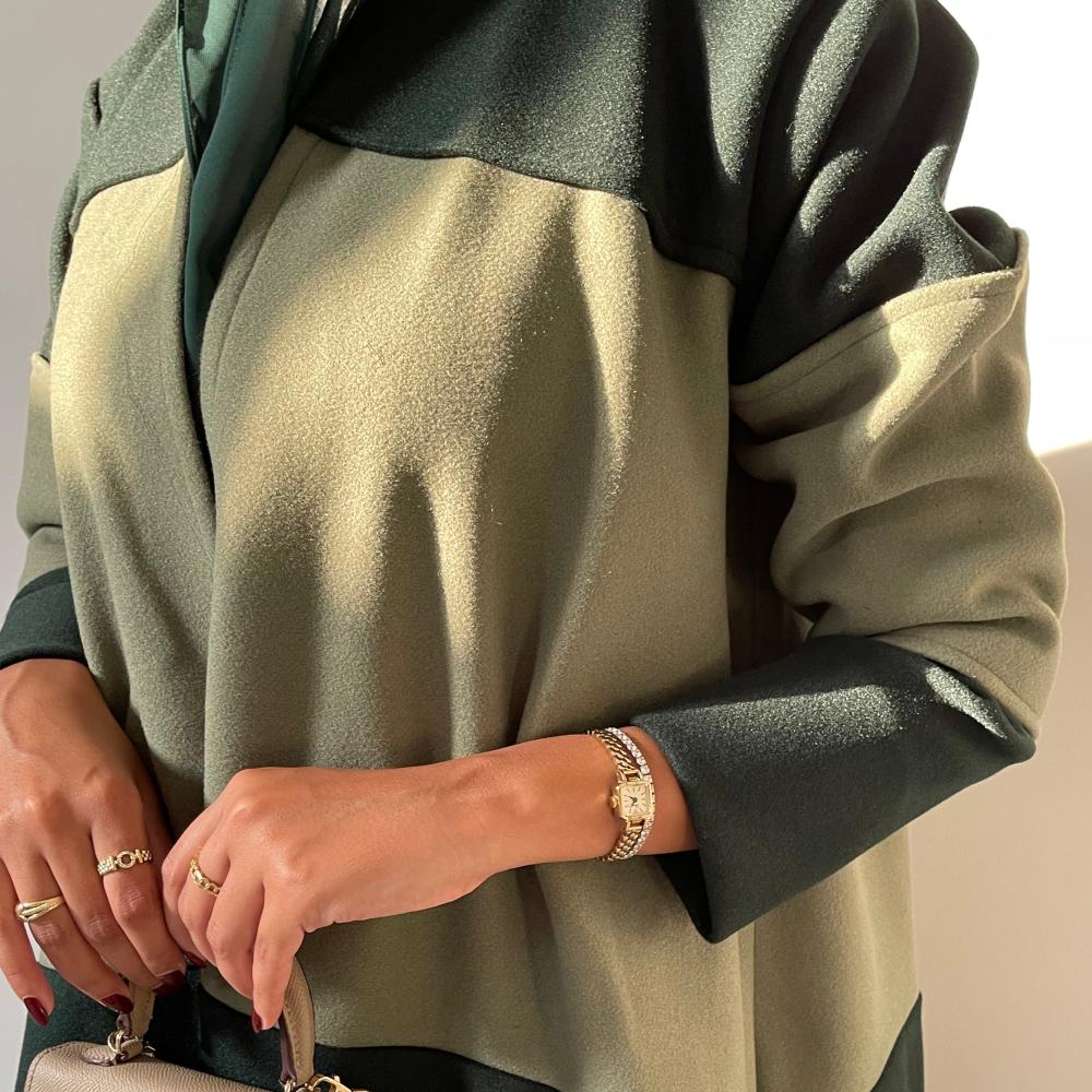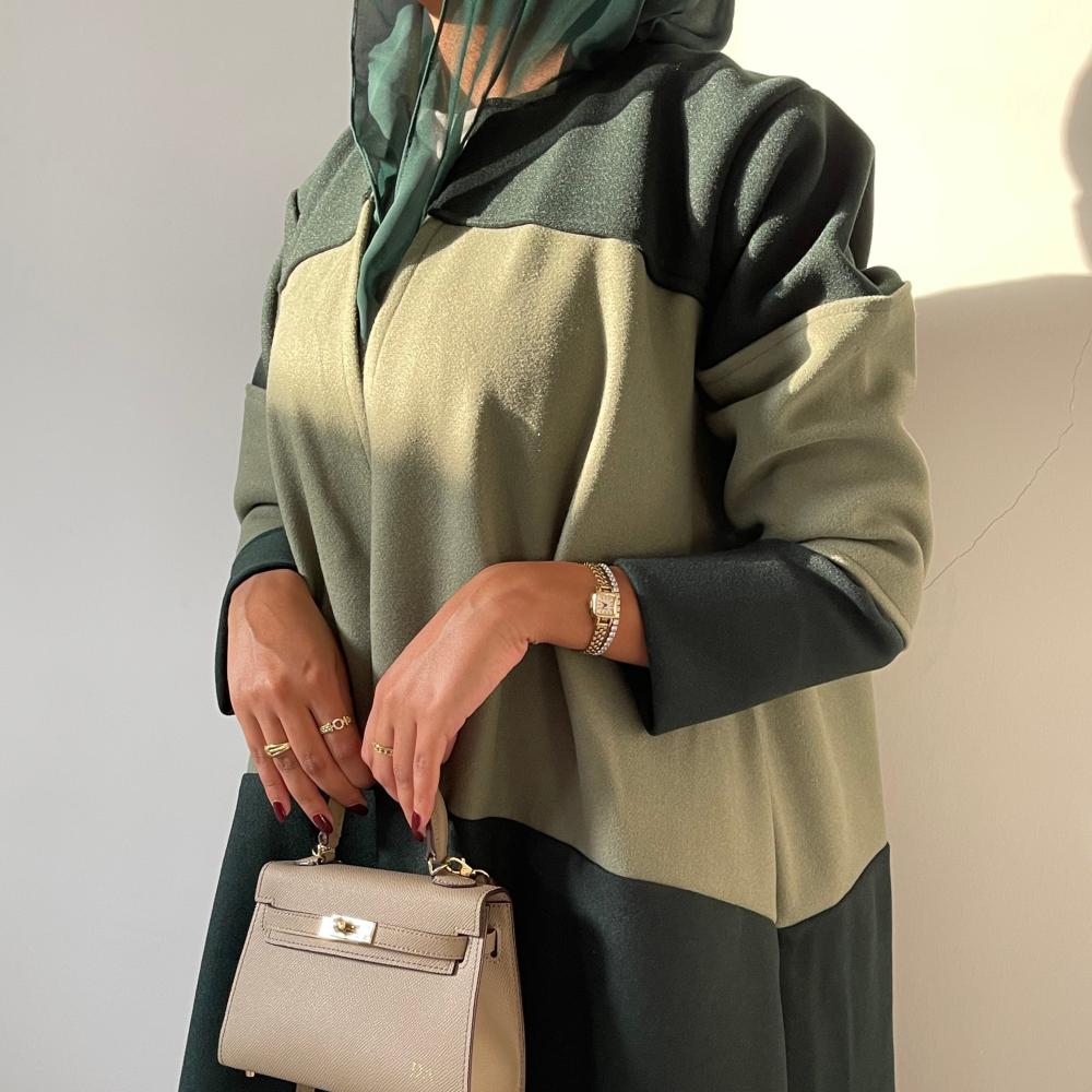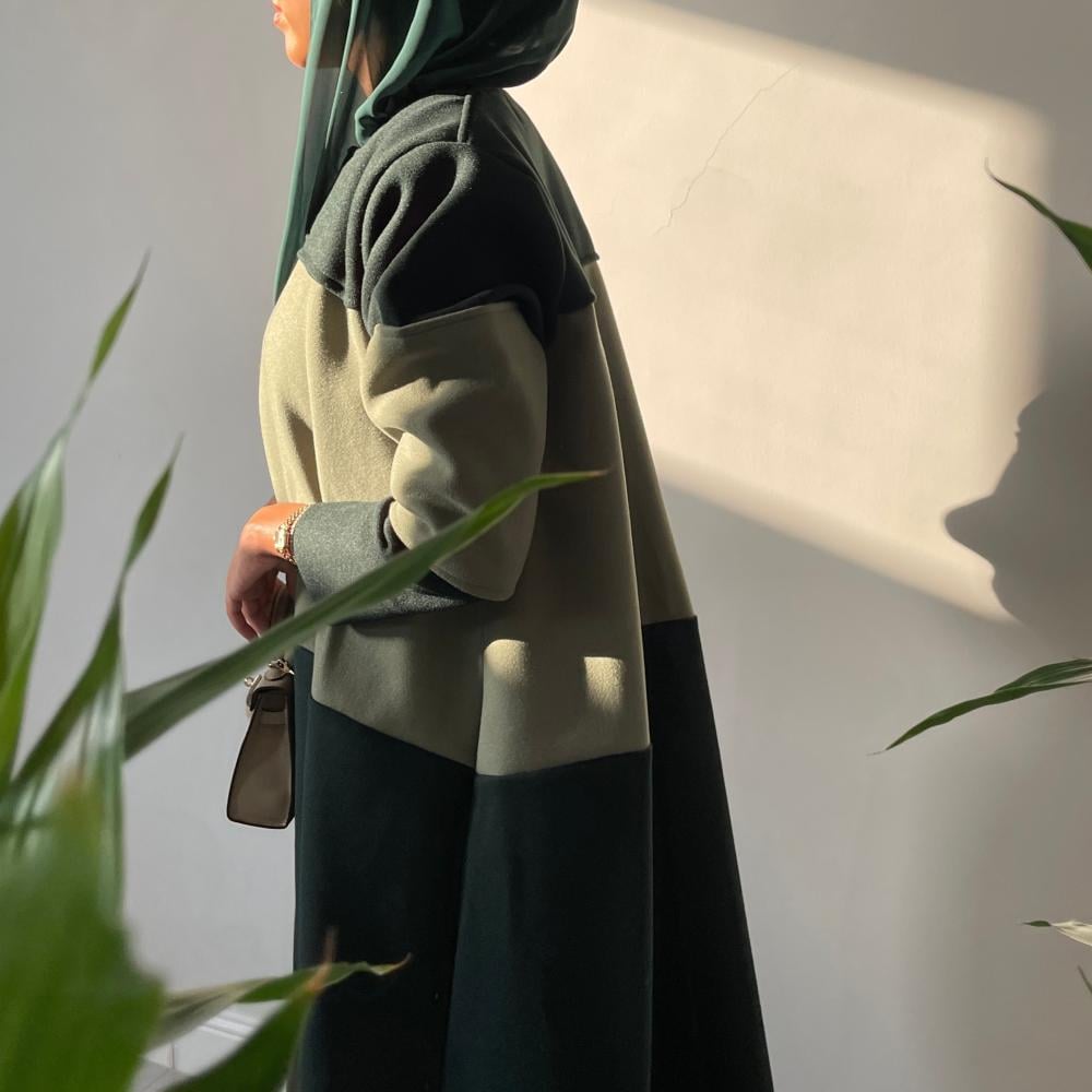 عباية شتوية بقصة كلوش واسع .. قماش جوخ أخضر غامق و فستقي ..